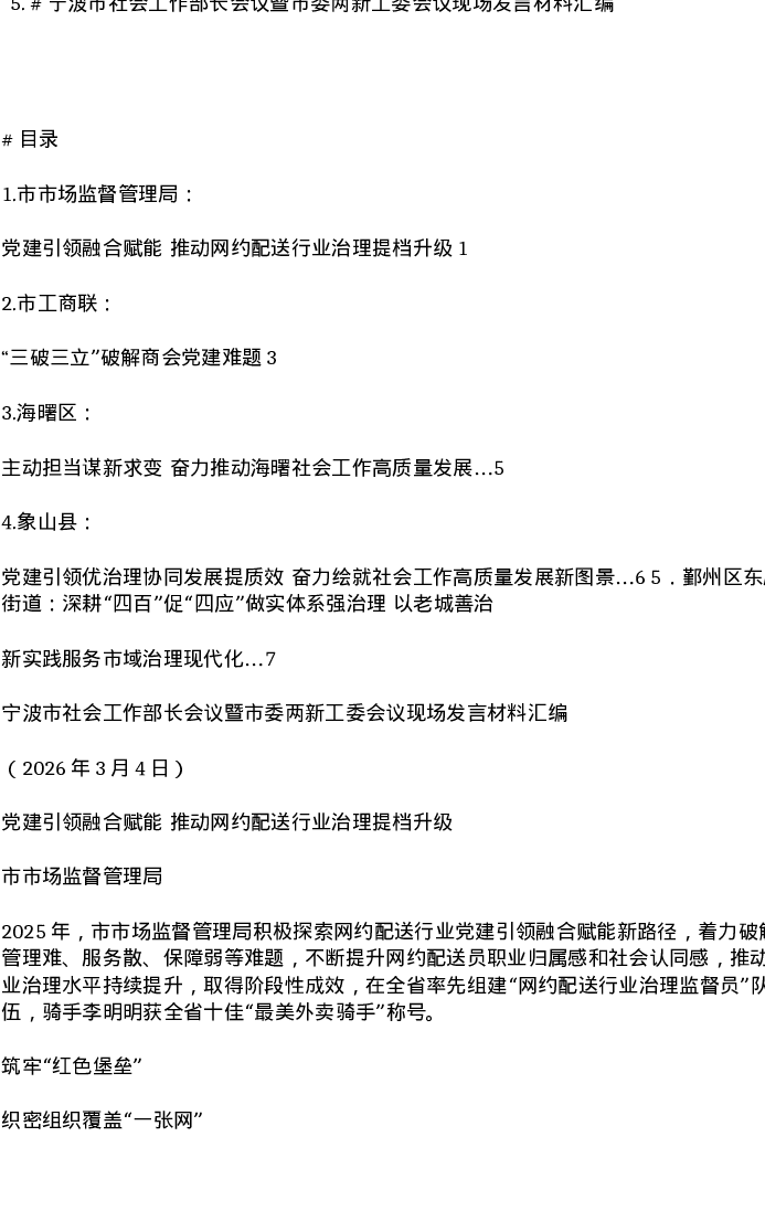汇编:宁波市社会工作部长会议暨市委两新工委会议现场发言5篇