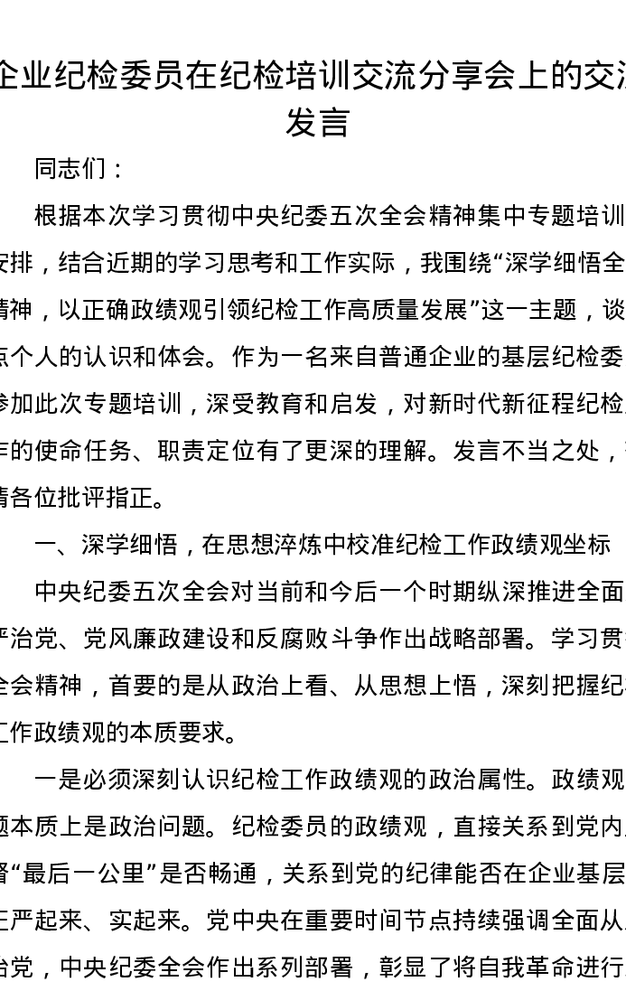 企业纪检委员在纪检培训交流分享会上的交流发言