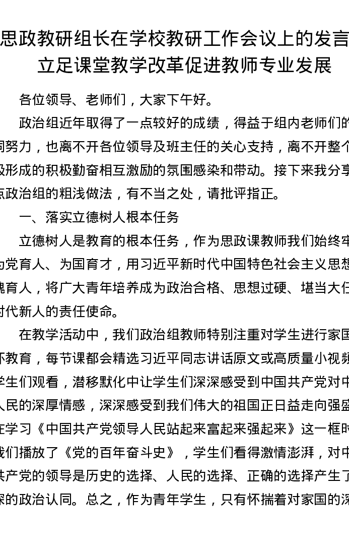 思政教研组长在学校教研工作会议上的发言:立足课堂教学改革促进教师专业发展