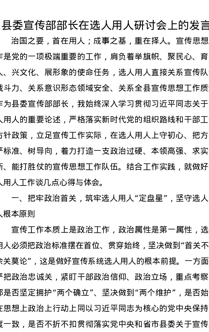 县委宣传部部长在选人用人研讨会上的发言