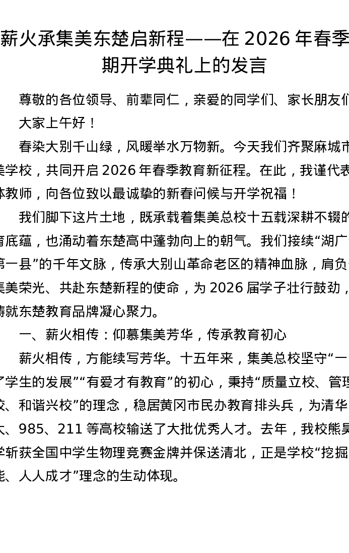 薪火承集美东楚启新程——在2026年春季学期开学典礼上的发言