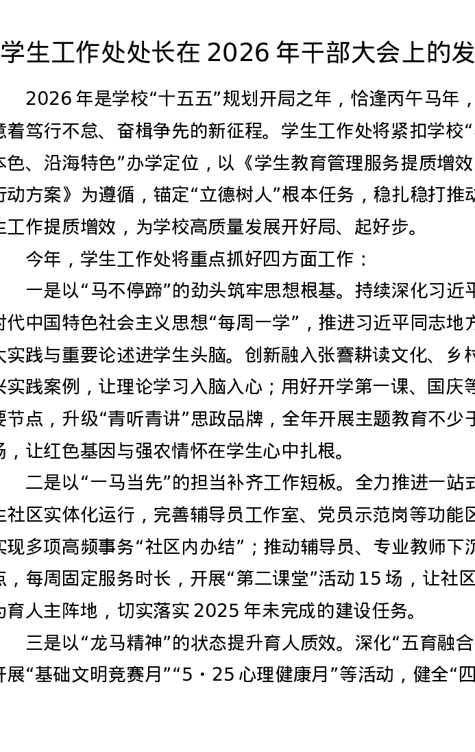 学生工作处处长在2026年干部大会上的发言