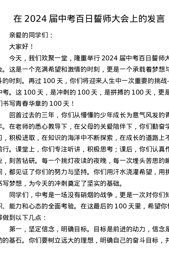 在2024届中考百日誓师大会上的发言