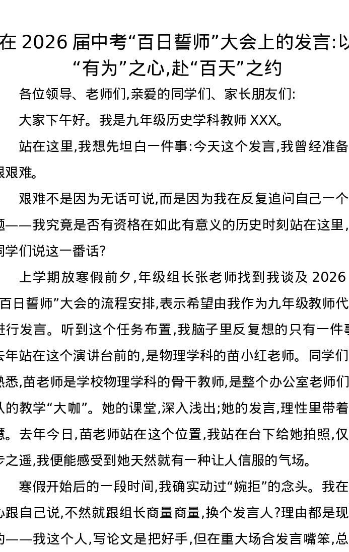 在2026届中考百日誓师大会上的发言以有为之心,赴百天之约