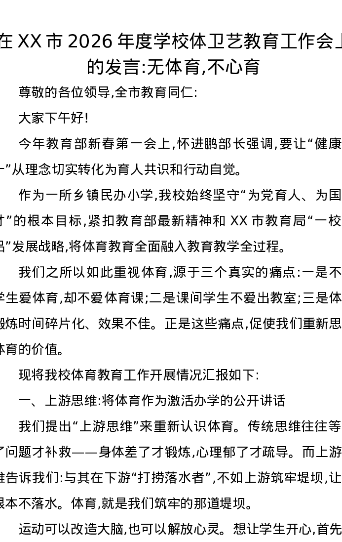 在XX市2026年度学校体卫艺教育工作会上的发言无体育,不心育