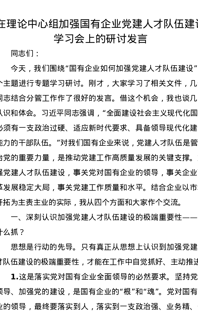 在理论中心组加强国有企业党建人才队伍建设学习会上的研讨发言