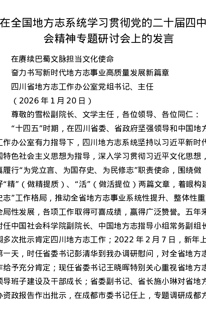 在全国地方志系统学习贯彻党的二十届四中全会精神专题研讨会上的发言