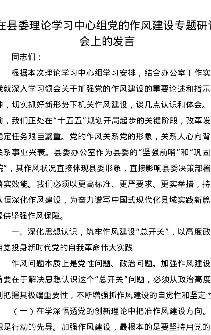 在县委理论学习中心组党的作风建设专题研讨会上的发言