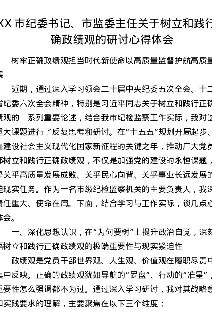 XX市纪委书记、市监委主任关于树立和践行正确ZJG的研讨心得体会