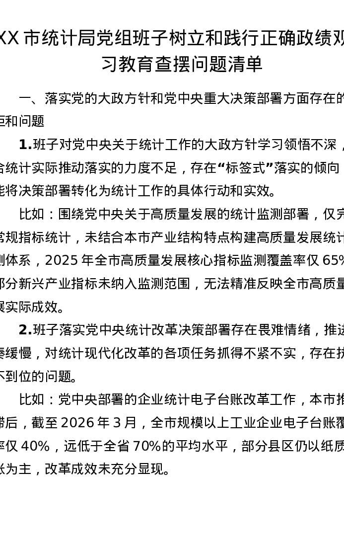 XX市统计局党组班子树立和践行正确ZJG学习教育查摆问题清单