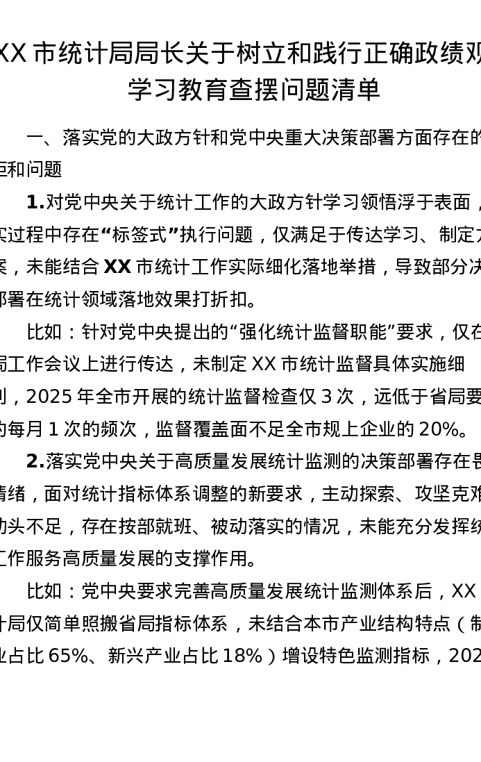 XX市统计局局长关于树立和践行正确ZJG的学习教育查摆问题清单