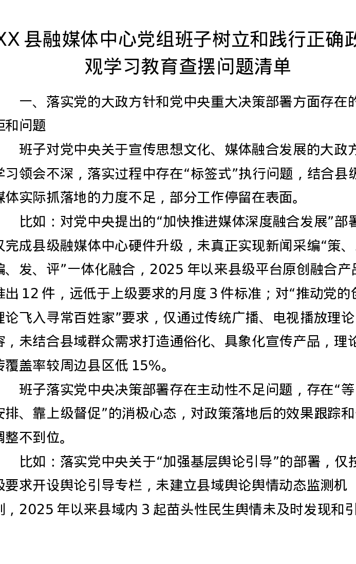XX县融媒体中心党组班子树立和践行正确ZJG学习教育查摆问题清单