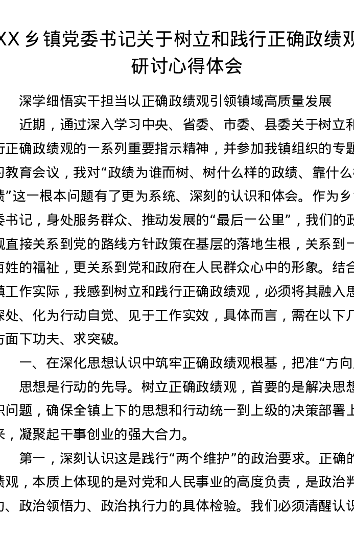 XX乡镇党委书记关于树立和践行正确ZJG的研讨心得体会