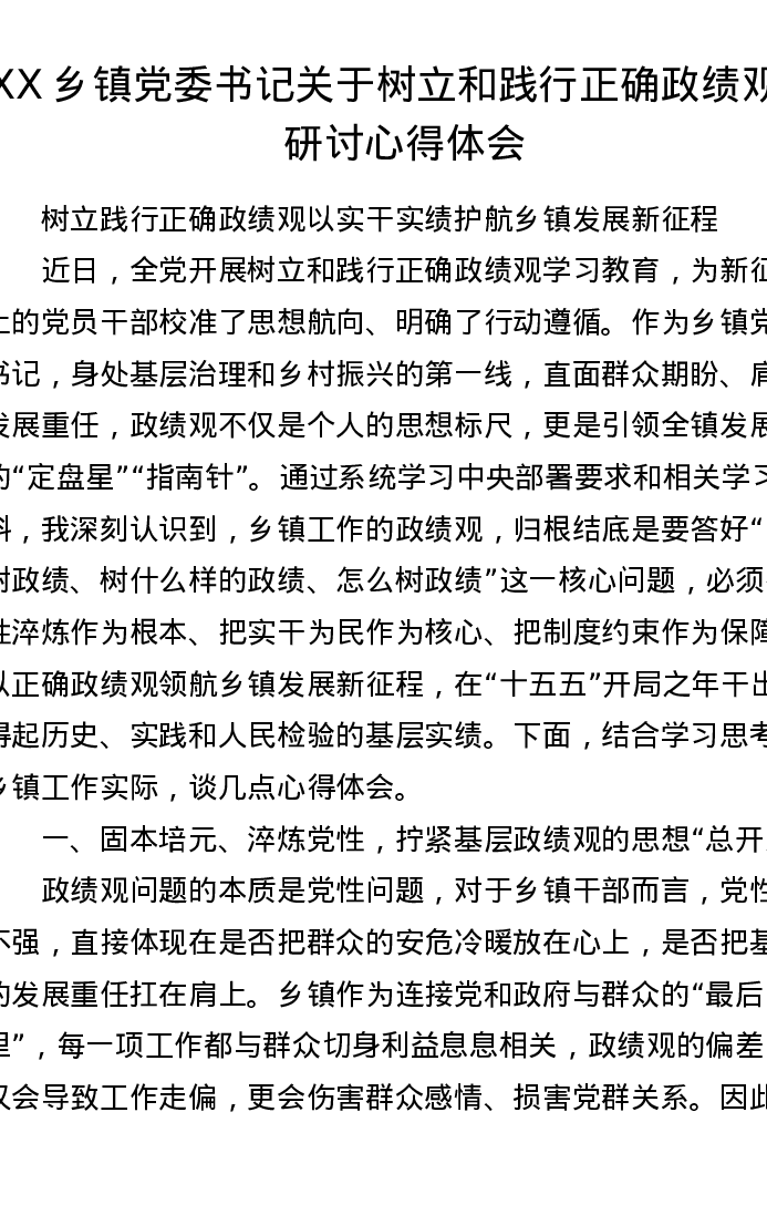 XX乡镇党委书记关于树立和践行正确ZJG的研讨心得体会2