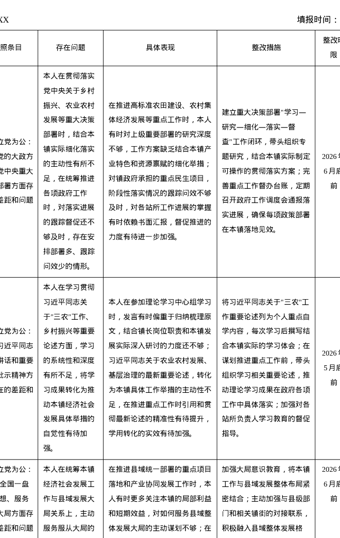 XX镇镇长正确ZJG学习教育个人对照查摆问题清单(表格)