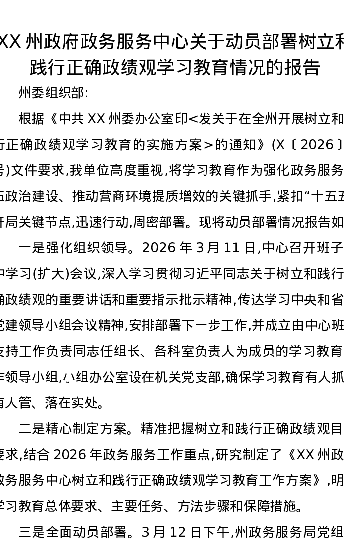 XX州政府政务服务中心关于动员部署树立和践行正确ZJG学习教育情况的报告