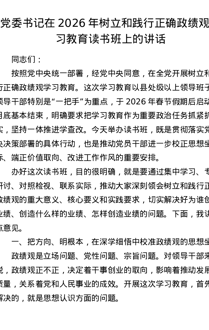 党委书记在2026年树立和践行正确ZJG学习教育读书班上的讲话