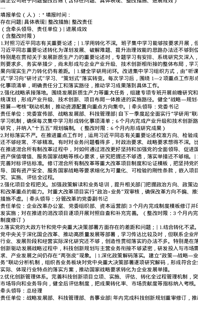 国企公司班子ZJG主题教育问题整改台账(含存在问题、具体表现、整改措施、进展成效)