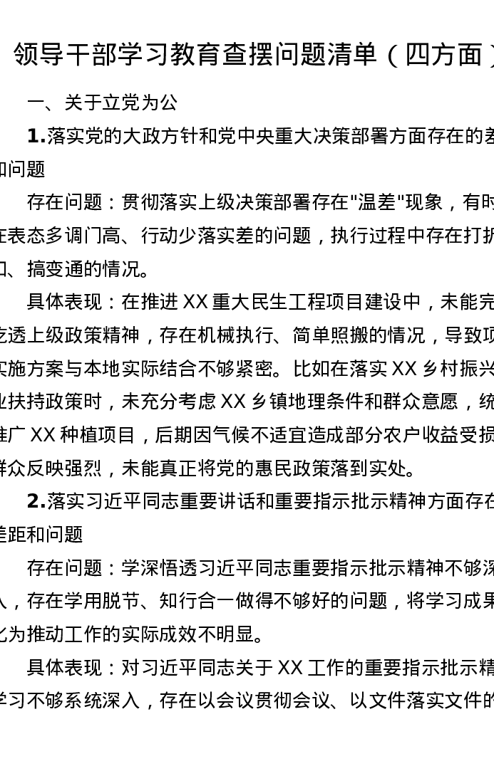领导干部ZJG学习教育查摆问题清单(四方面)