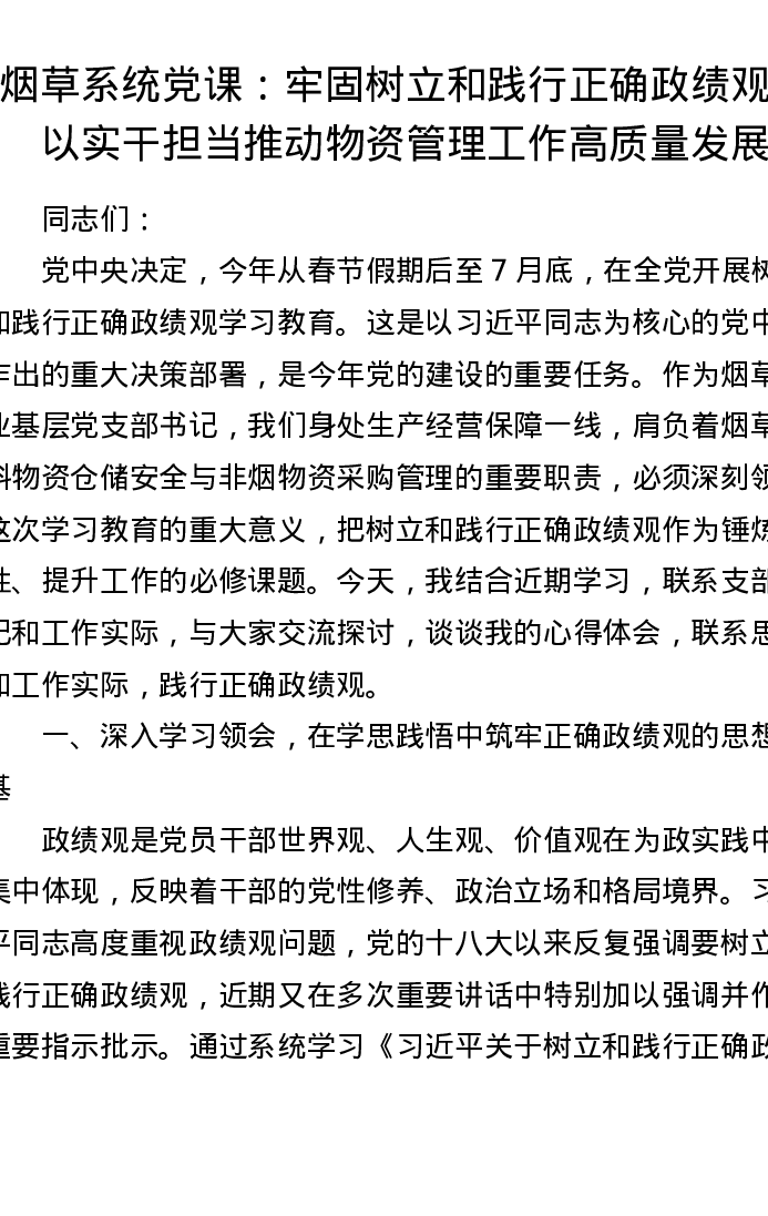 烟草系统党课:牢固树立和践行正确ZJG,以实干担当推动物资管理工作高质量发展
