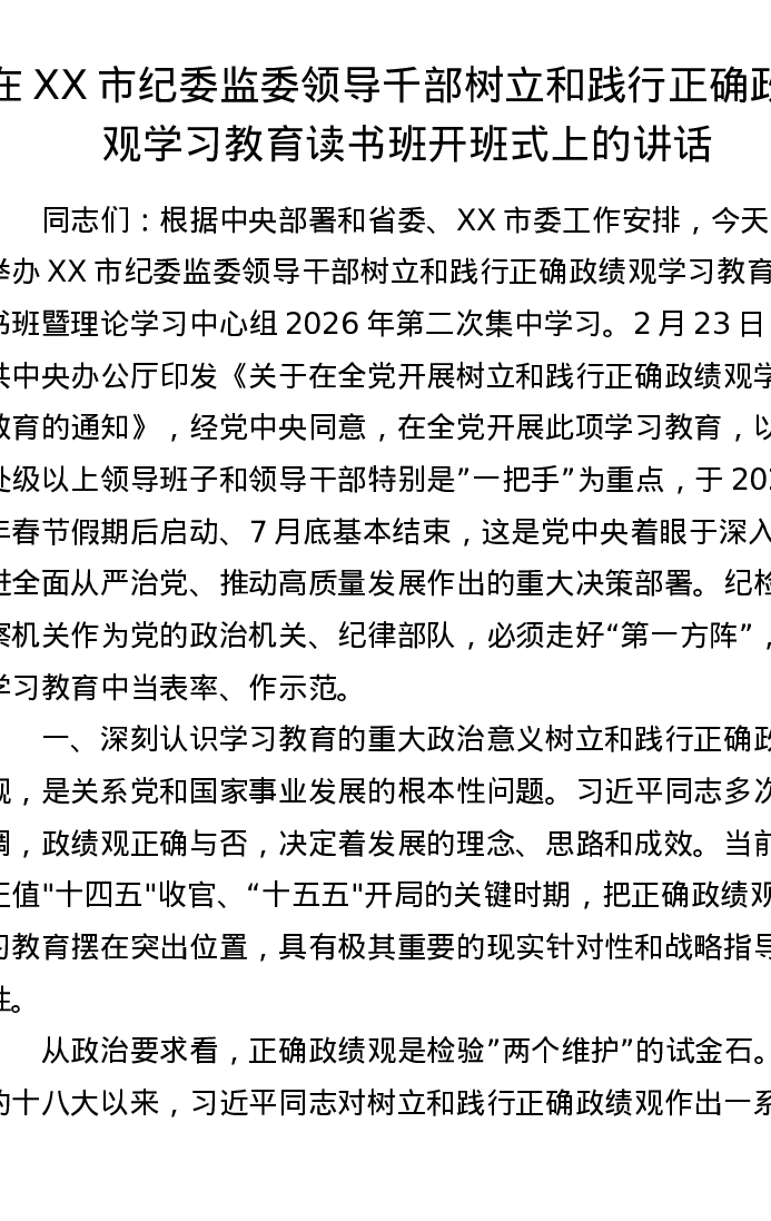在XX市纪委监委领导千部树立和践行正确ZJG学习教育读书班开班式上的讲话