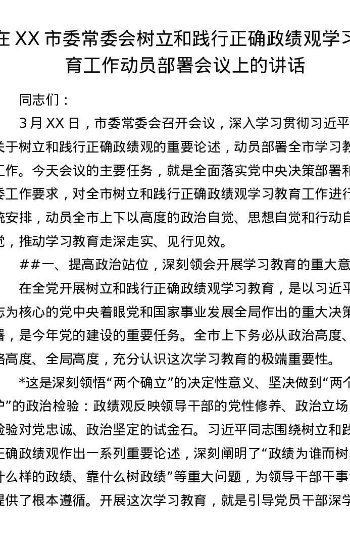 在XX市委常委会树立和践行正确ZJG学习教育工作动员部署会议上的讲话