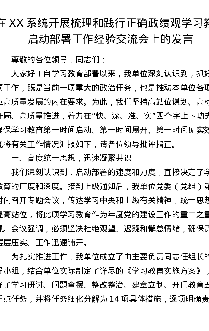在XX系统开展梳理和践行正确ZJG学习教育启动部署工作经验交流会上的发言