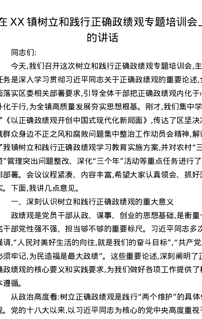 在XX镇树立和践行正确ZJG专题培训会上的讲话