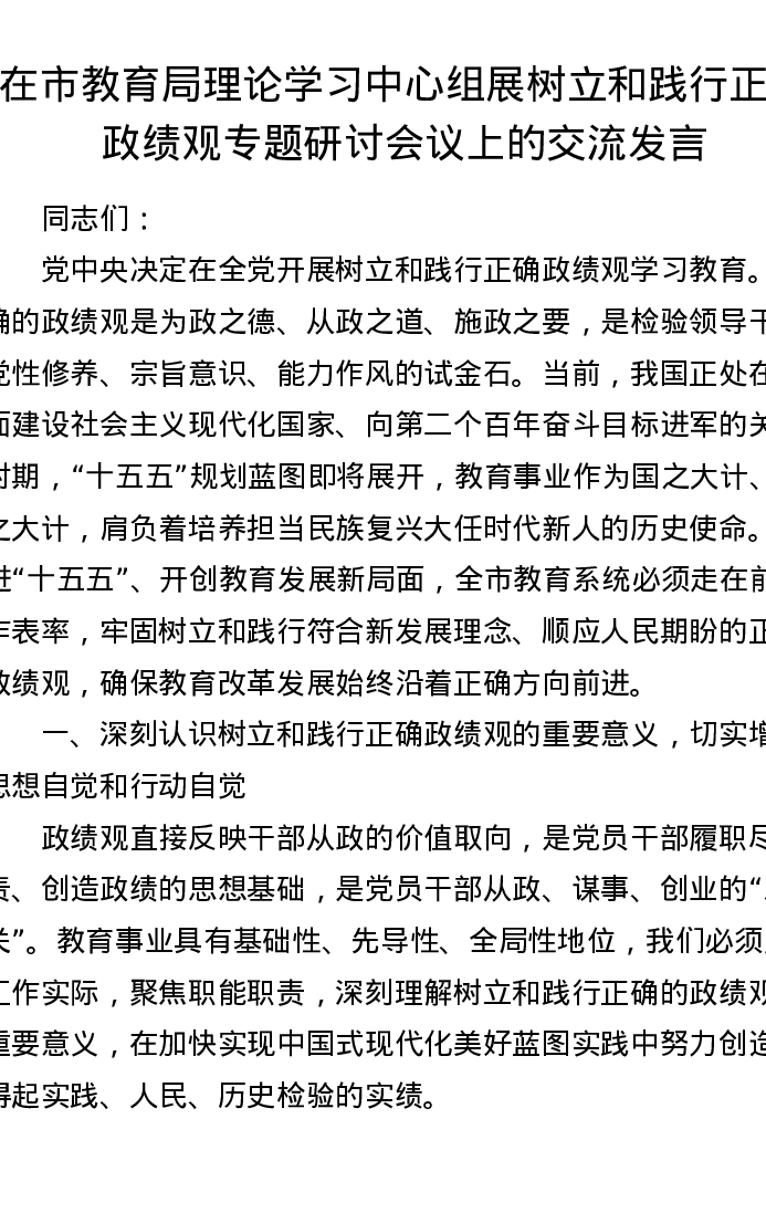 在市教育局理论学习中心组展树立和践行正确ZJG专题研讨会议上的交流发言