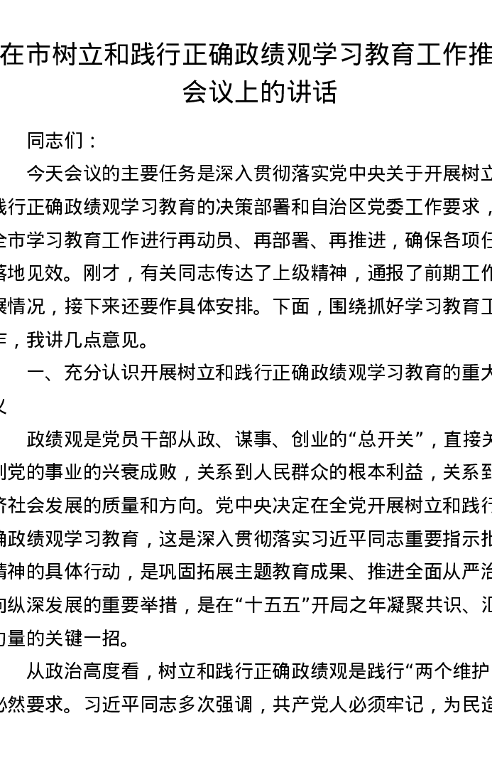 在市树立和践行正确ZJG学习教育工作推进会议上的讲话