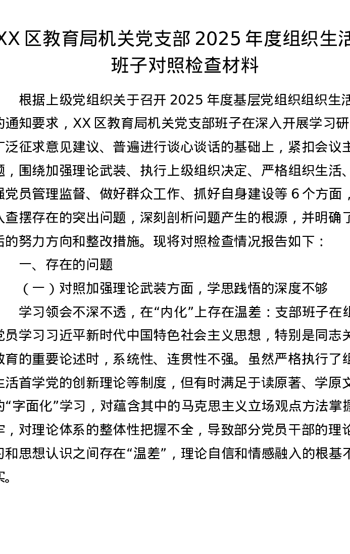 XX区教育局机关党支部2025年度组织xxx班子对照检查材料2