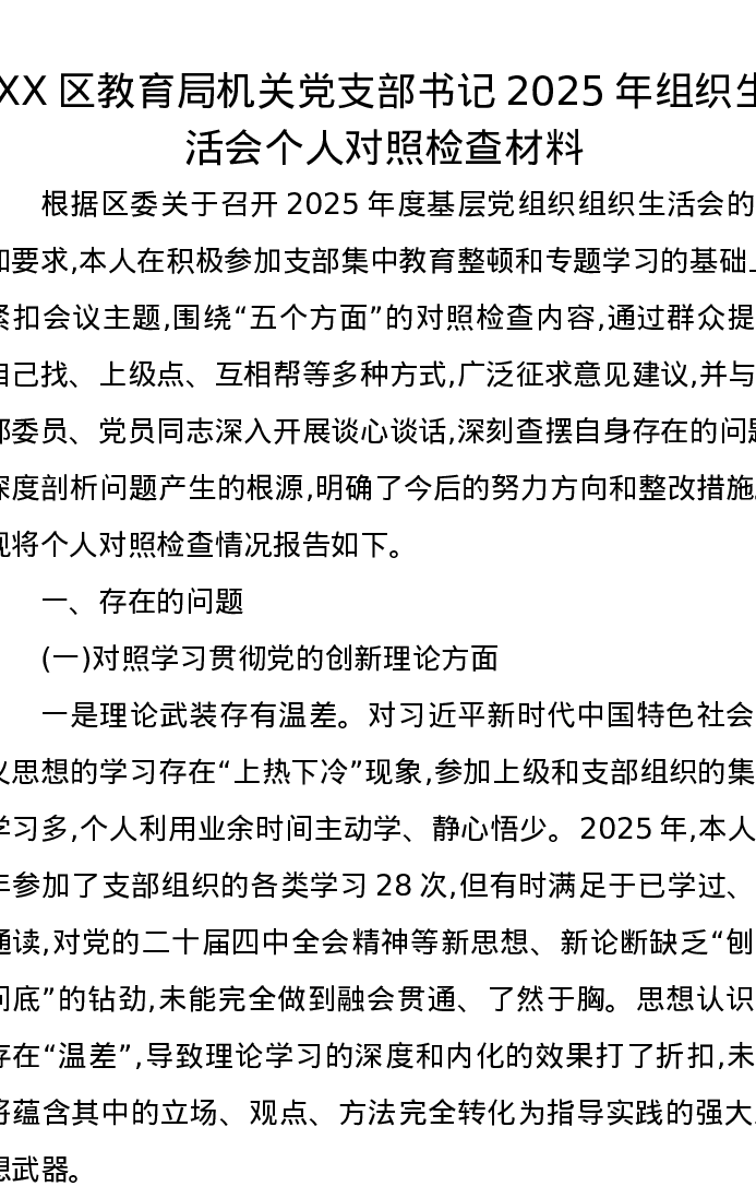 XX区教育局机关党支部书记2025年组织xxx个人对照检查材料