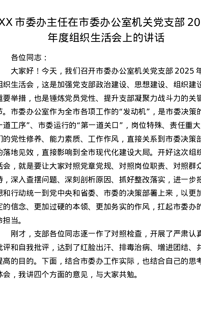 XX市委办主任在市委办公室机关党支部2025年度组织xxx上的讲话