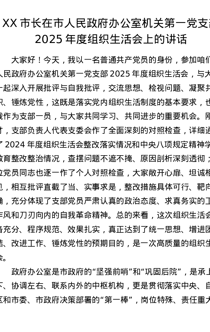 XX市长在市人民政府办公室机关第一党支部2025年度组织xxx上的讲话