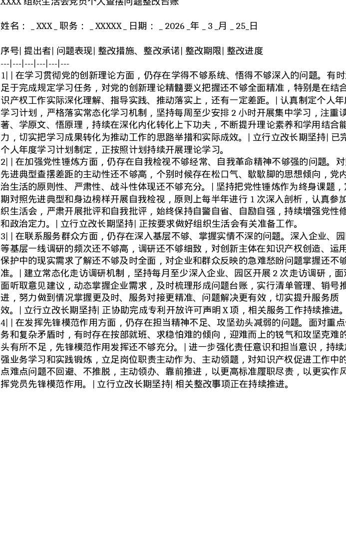 表格2025年度组织xxx党员个人查摆问题整改台账