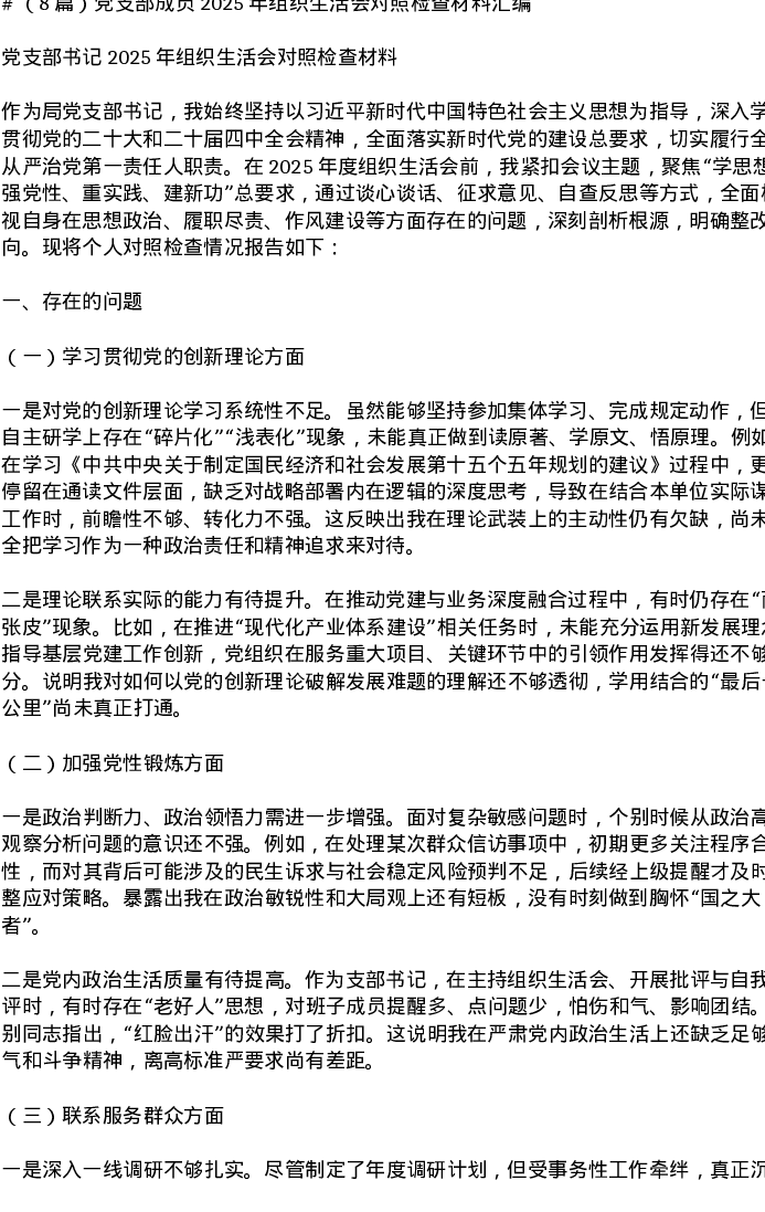 汇编:党支部成员2025年组织xxx对照检查材料8篇
