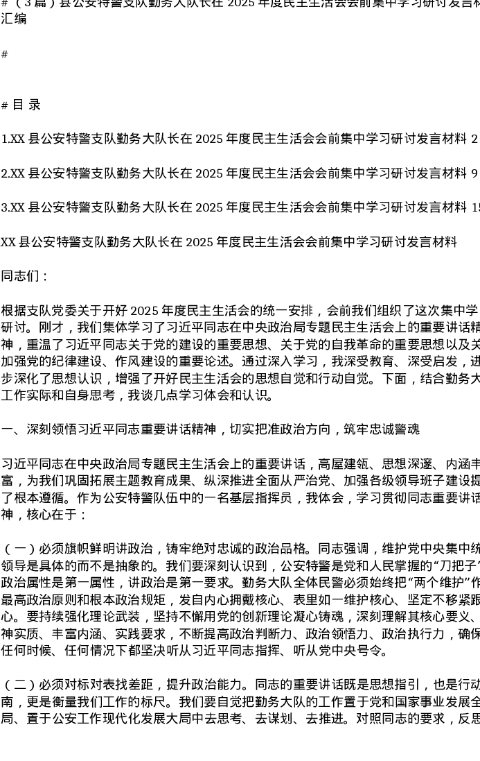 汇编:县公安特警支队勤务大队长在2025年度xxxxx会前集中学习研讨发言3篇