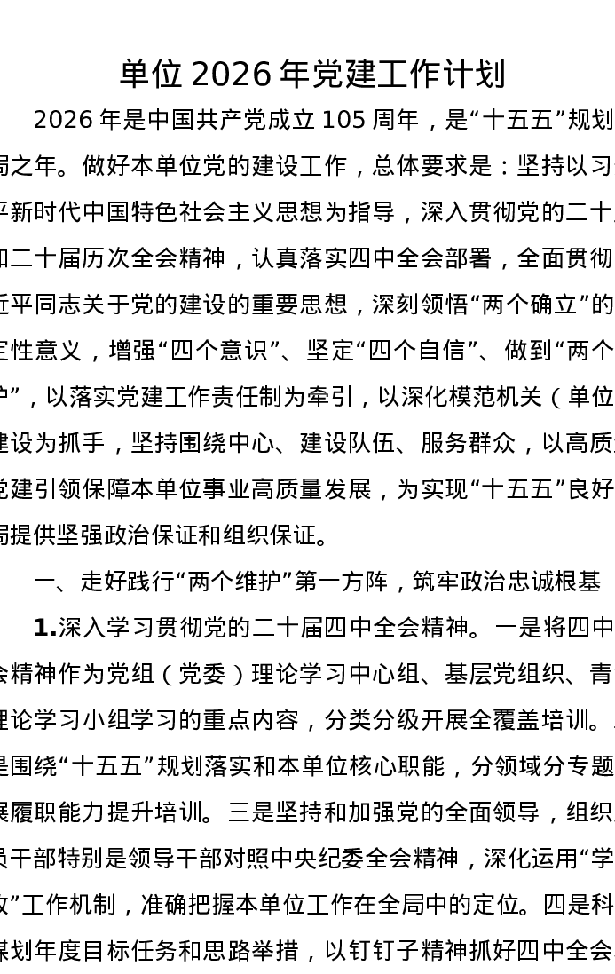 单位2026年党建工作计划