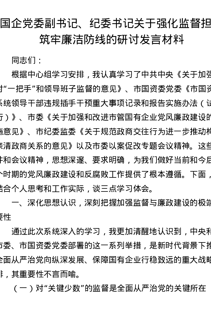 国企党委副书记、纪委书记关于强化监督担当 筑牢廉洁防线的研讨发言材料