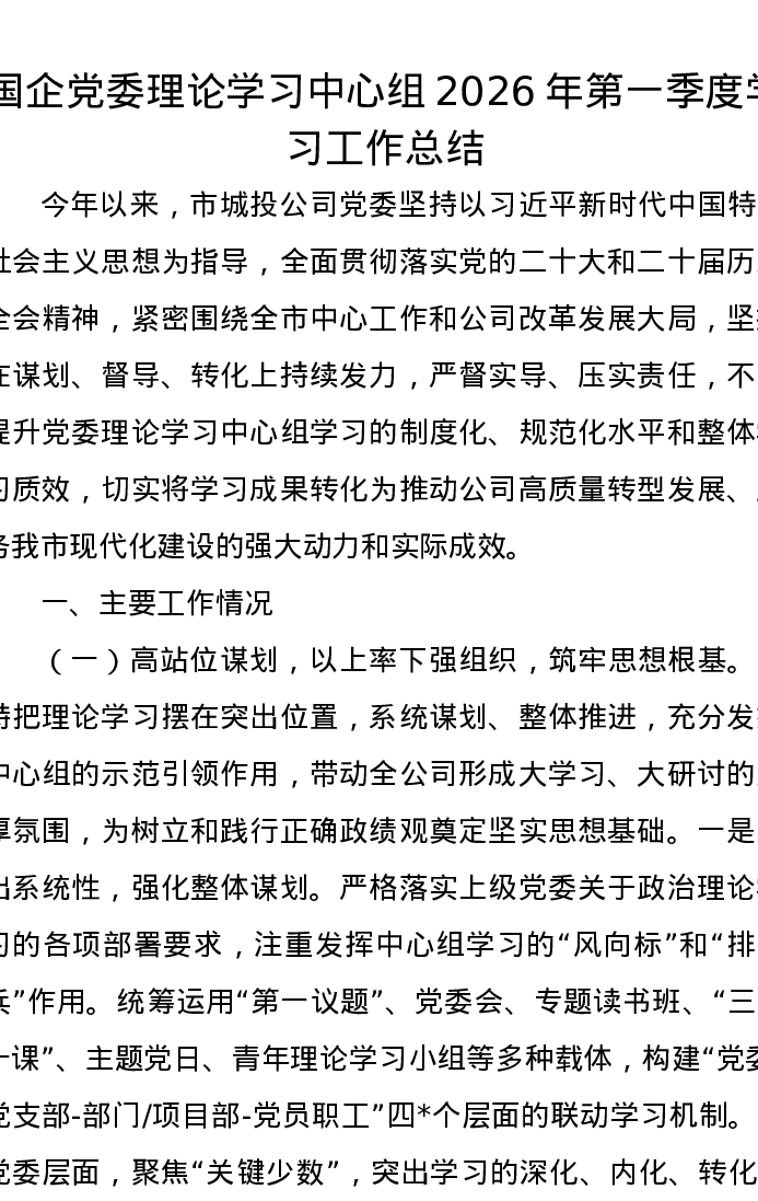 国企党委理论学习中心组2026年第一季度学习工作总结