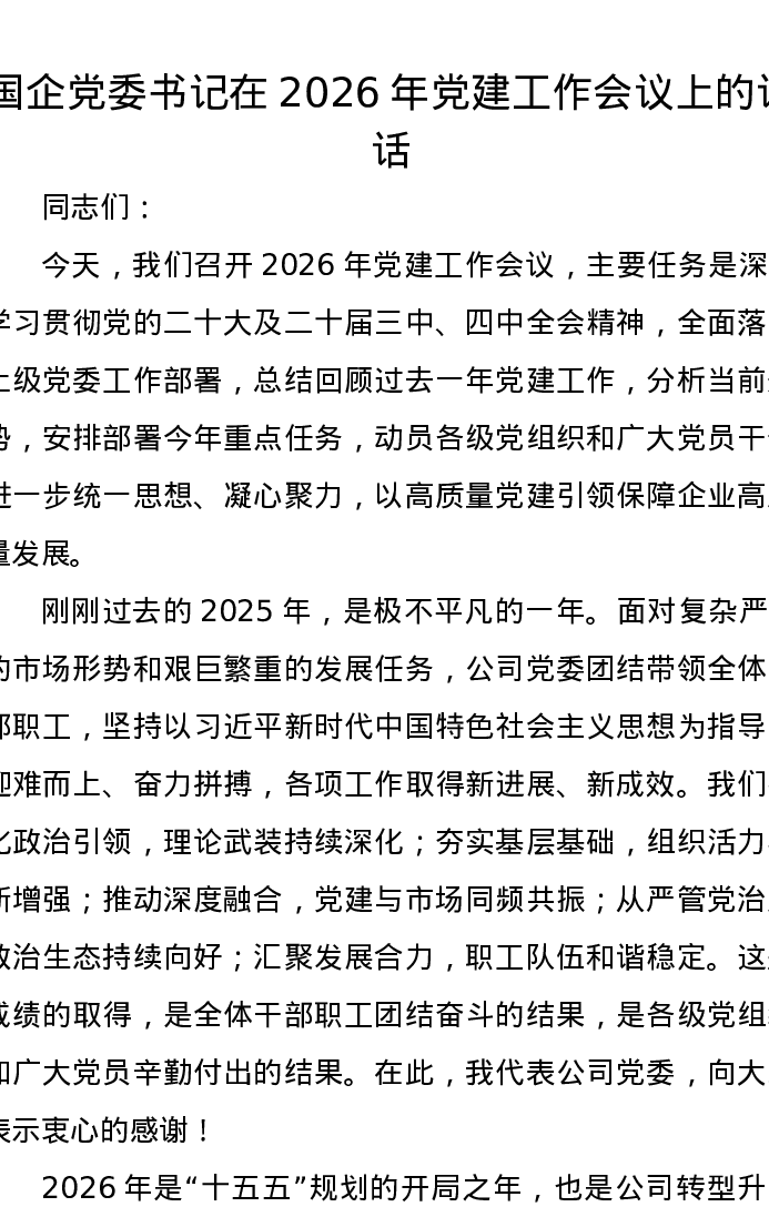 国企党委书记在2026年党建工作会议上的讲话