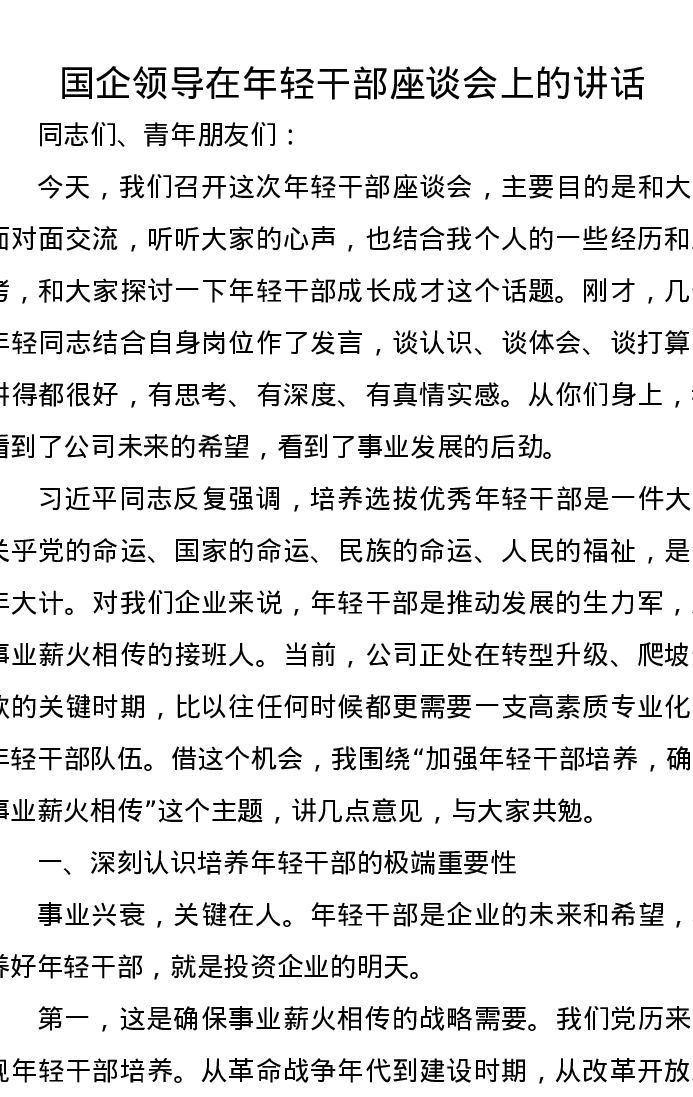 国企领导在年轻干部座谈会上的讲话