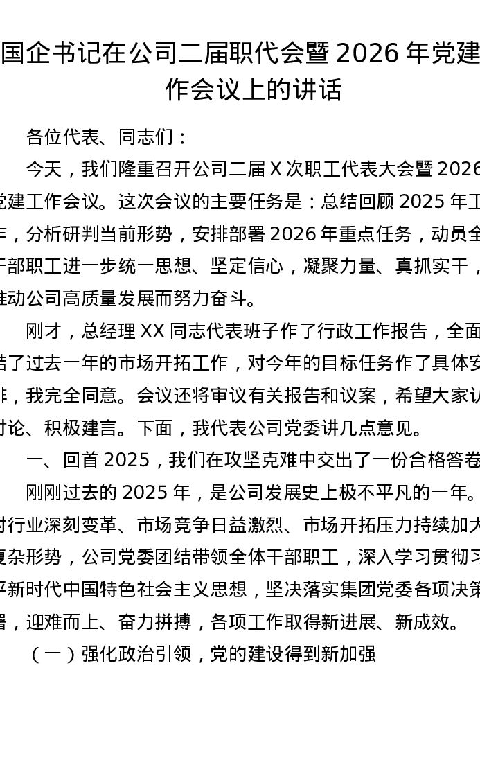 国企书记在公司二届职代会暨2026年党建工作会议上的讲话