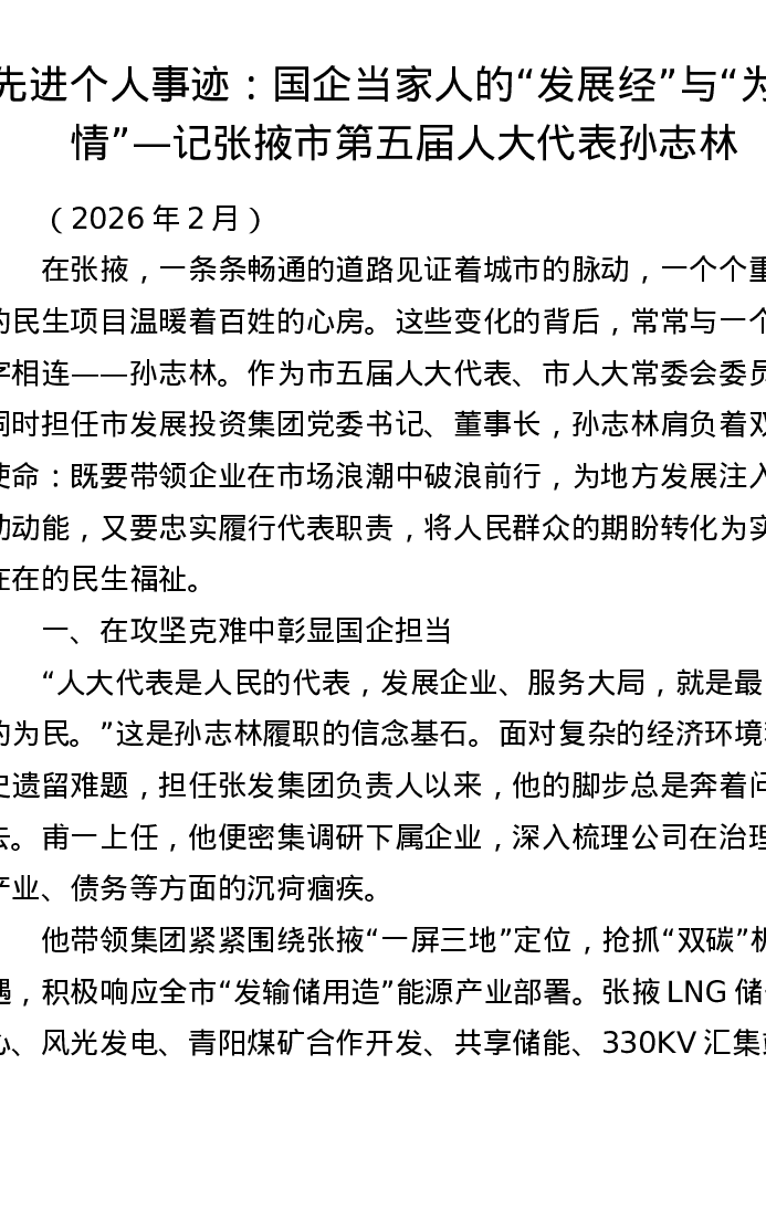 先进个人事迹:国企当家人的发展经与为民情—记张掖市第五届人大代表孙志林