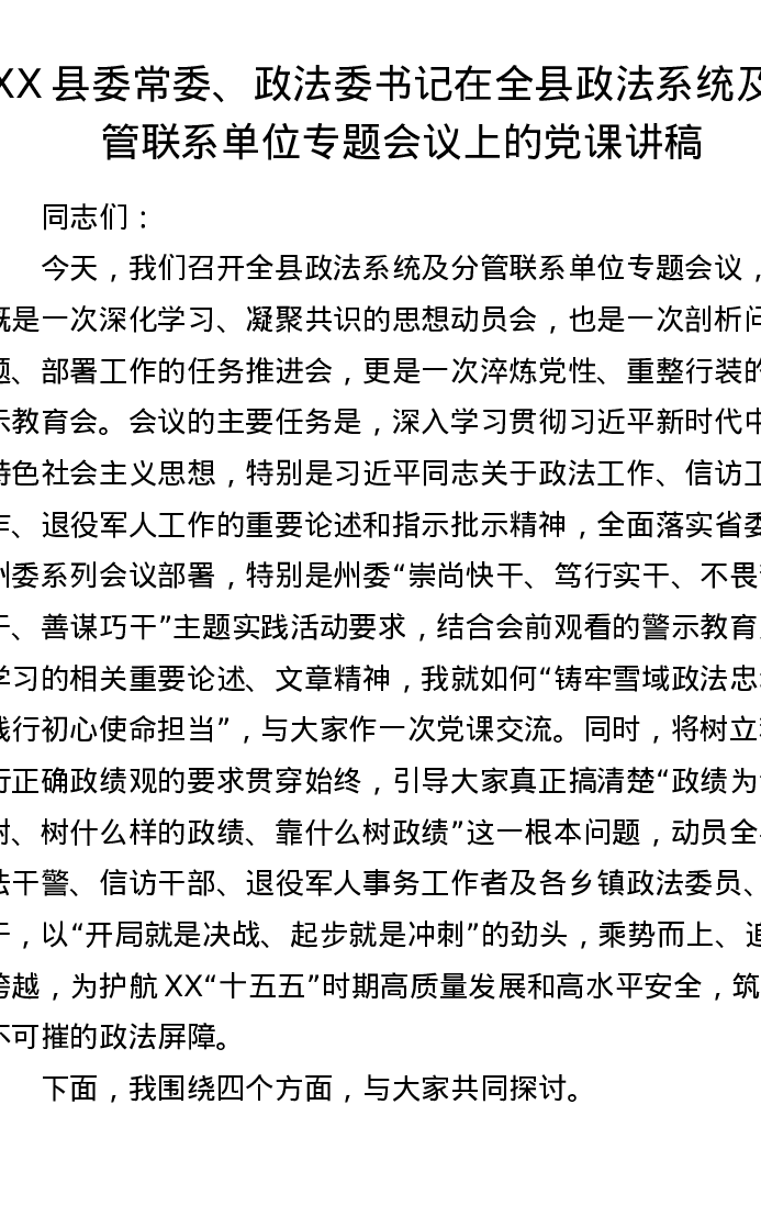 XX县委常委、政法委书记在全县政法系统及分管联系单位专题会议上的党课讲稿2