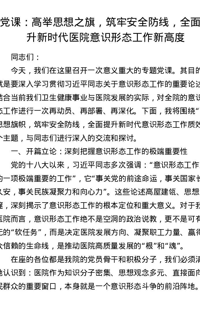 党课:高举思想之旗,筑牢安全防线,全面提升新时代医院意识形态工作新高度