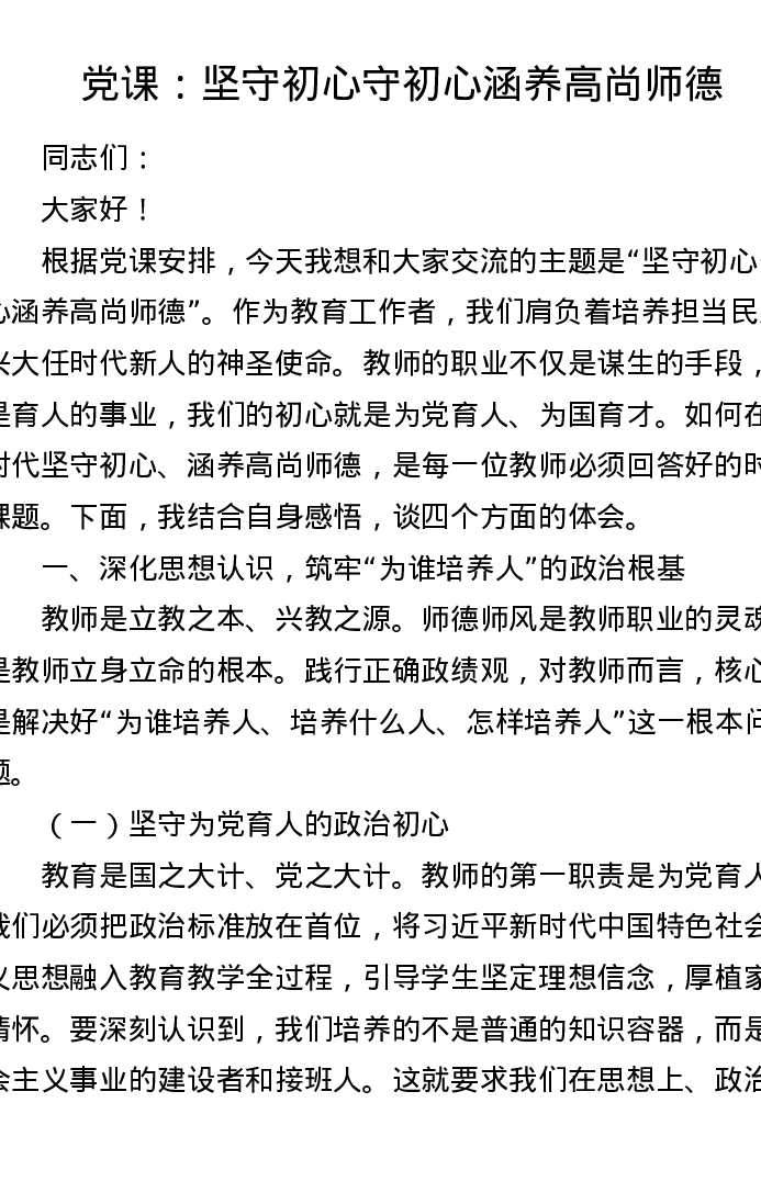 党课:坚守初心守初心 涵养高尚师德