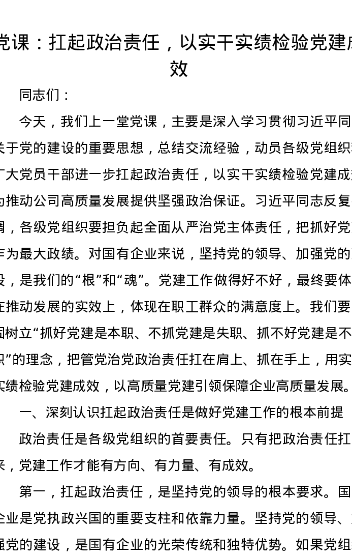 党课:扛起政治责任,以实干实绩检验党建成效