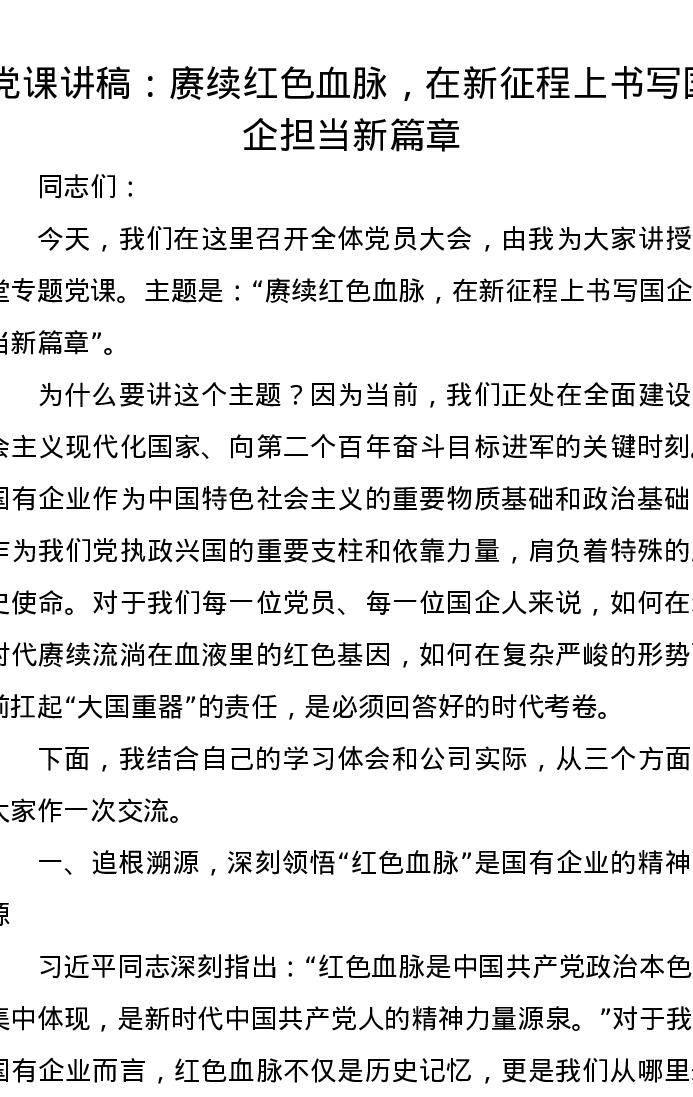 党课讲稿:赓续红色血脉,在新征程上书写国企担当新篇章