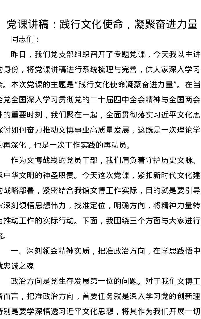 党课讲稿:践行文化使命,凝聚奋进力量